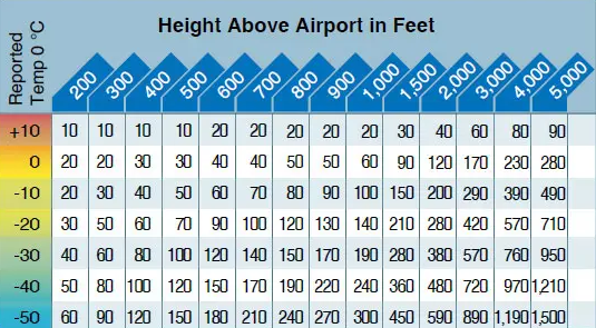 Look at the chart using a temperature of –10 °C and an aircraft altitude of 1,000 feet above the airport elevation. The chart shows that the reported current altimeter setting may place the aircraft as much as 100 feet below the altitude indicated by the altimeter.