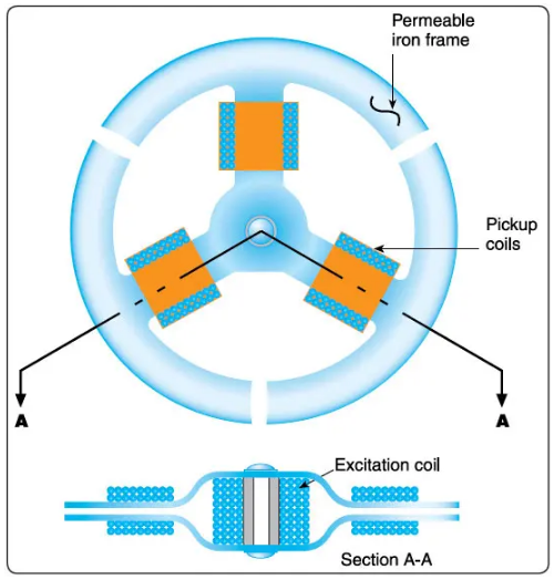 The three coils are connected to three similar but smaller coils in a synchro inside the instrument case. The synchro rotates the dial of a radio magnetic indicator (RMI) or a HSI.