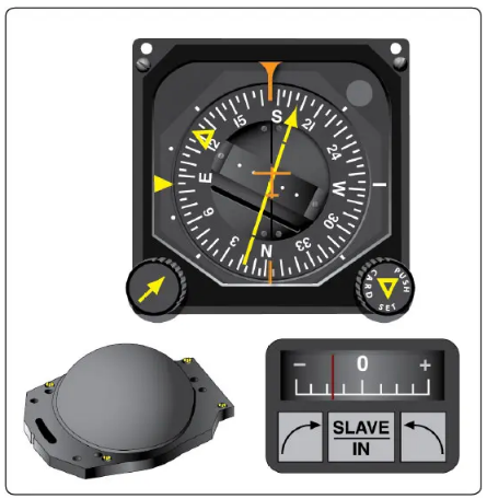 A separate unit, the magnetic slaving transmitter, is mounted remotely, usually in a wingtip to eliminate the possibility of magnetic interference. It contains the flux valve, which is the direction-sensing device of the system. A concentration of lines of magnetic force, after being amplified, becomes a signal relayed to the heading indicator unit, which is also remotely mounted. This signal operates a torque motor in the heading indicator unit that processes the gyro unit until it is aligned with the transmitter signal. The magnetic slaving transmitter is connected electrically to the HSI.