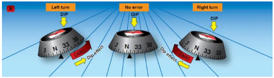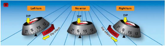 If the compass needle were mounted so that it could pivot freely in three dimensions, it would align itself with the magnetic field, pointing up or down at the dip angle in the direction of local Magnetic North. Because the dip angle is of no navigational interest, the compass is made so that it can rotate only in the horizontal plane. This is done by lowering the center of gravity below the pivot point and making the assembly heavy enough that the vertical component of the magnetic force is too weak to tilt it significantly out of the horizontal plane. The compass can then work effectively at all latitudes without specific compensation for dip. However, close to the magnetic poles, the horizontal component of the Earth’s field is too small to align the compass which makes the compass unusable for navigation. Because of this constraint, the compass only indicates correctly if the card is horizontal. Once tilted out of the horizontal plane, it will be affected by the vertical component of the Earth’s field which leads to the following discussions on northerly and southerly turning errors.