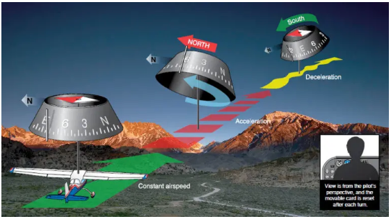 The magnetic dip and the forces of inertia cause magnetic compass errors when accelerating and decelerating on easterly and westerly headings. Because of the penduloustype mounting, the aft end of the compass card is tilted upward when accelerating and downward when decelerating during changes of airspeed. When accelerating on either an easterly or westerly heading, the error appears as a turn indication toward north. When decelerating on either of these headings, the compass indicates a turn toward south. A mnemonic, or memory jogger, for the effect of acceleration error is the word “ANDS” (Acceleration- North/Deceleration-South) may help you to remember the acceleration error. [Figure 1-37] Acceleration causes an indication toward north; deceleration causes an indication toward south.