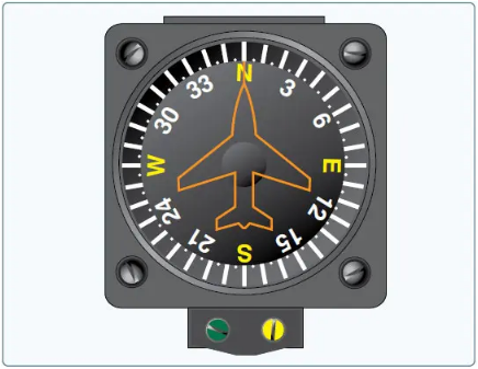 The vertical card magnetic compass eliminates some of the errors and confusion encountered with the magnetic compass. The dial of this compass is graduated with letters representing the cardinal directions, numbers every 30°, and tick marks every 5°. The dial is rotated by a set of gears from the shaft-mounted magnet, and the nose of the symbolic aircraft on the instrument glass represents the lubber line for reading the heading of the aircraft from the dial. [Figure 1-38]