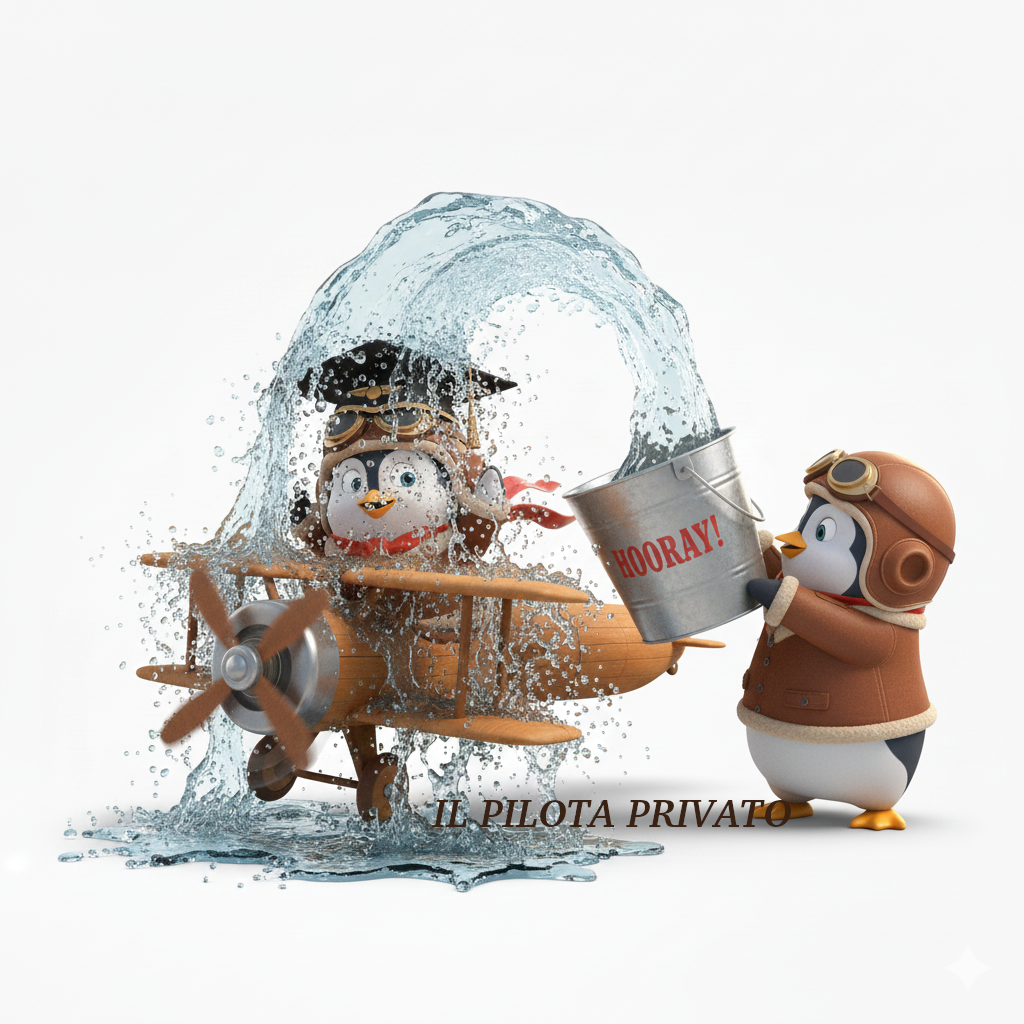 In sintesi, la foto cattura l'epilogo gioioso e bagnato del primo volo solista. È un'immagine ricca di azione e umorismo, che celebra il successo del giovane pilota con una tradizione goliardica.