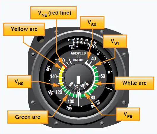 As shown in Figure 1-8, ASIs on single-engine small aircraft include the following standard color-coded markings: