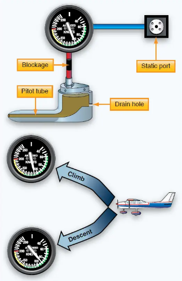 Errors almost always indicate blockage of the pitot tube, the static port(s), or both. Blockage may be caused by moisture (including ice), dirt, or even insects. During preflight, make sure the pitot tube cover is removed. Then, check the pitot and static port openings. A blocked pitot tube affects the accuracy of the ASI, but a blockage of the static port not only affects the ASI, but also causes errors in the altimeter and VSI.