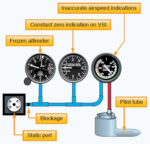 A blockage of the static system also affects the altimeter and VSI. Trapped static pressure causes the altimeter to freeze at the altitude where the blockage occurred. In the case of the VSI, a blocked static system produces a continuous zero indication. [Figure 1-11]