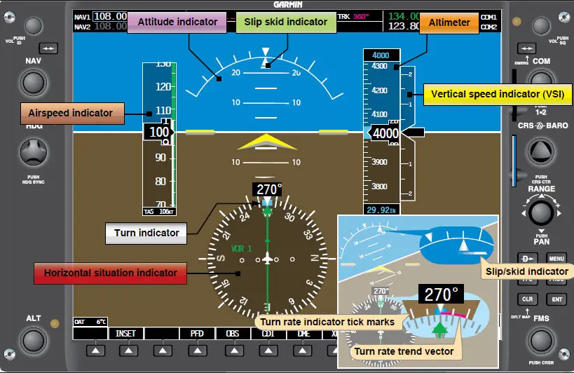 The turn indicator takes a slightly different form than the traditional instrumentation. A sliding bar moves left and right below the triangle to indicate deflection from coordinated flight. [Figure 1-12] Reference for coordinated flight comes from accelerometers contained in the AHRS unit.