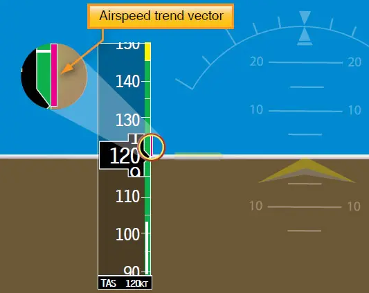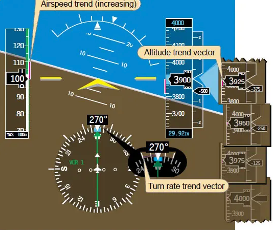 Trend vectors are magenta lines that move up and down both the ASI and the altimeter. [Figures 1-16 and 1-17] The ADC computes the rate of change and displays the 6-second projection of where the aircraft will be. Pilots can utilize the trend vectors to better control the aircraft’s attitude. By including the trend vectors in the instrument scan, pilots are able to precisely control airspeed and altitude. Additional information can be obtained by referencing the Instrument Flying Handbook or specific avionics manufacturer’s training material.