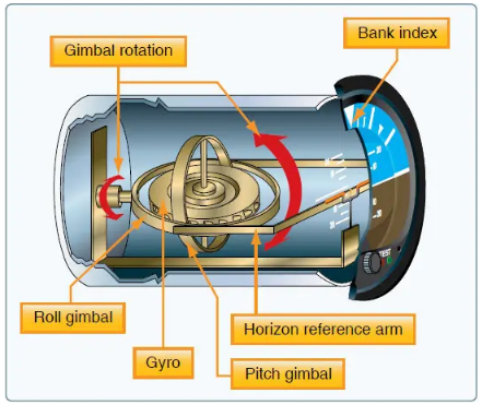 The gyro in the attitude indicator is mounted in a horizontal plane and depends upon rigidity in space for its operation. The horizon bar represents the true horizon. This bar is fixed to the gyro and remains in a horizontal plane as the aircraft is pitched or banked about its lateral or longitudinal axis, indicating the attitude of the aircraft relative to the true horizon. [Figure 1-23]